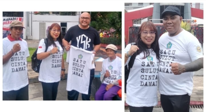 Dalam suasana yang hangat dan akrab, panitia membagikan kaus bertema “Satu Sulut Cinta Damai” disertai dengan makanan ringan kepada masyarakat yang hadir. Kegiatan ini secara nyata memvisualisasikan bahwa semangat gotong-royong dan nilai-nilai perdamaian masih hidup dan mengalir kuat di tengah masyarakat Sulawesi Utara.