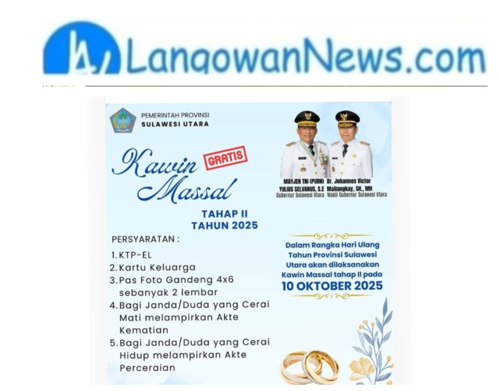Manado LANGOWANNEWS.COM Pemerintah Provinsi (Pemprov) Sulawesi Utara kembali menunjukkan komitmennya dalam memperkuat ketahanan keluarga melalui pelaksanaan Program Kawin Massal Gratis Tahap II, yang dijadwalkan berlangsung pada 10/10/25 mendatang
