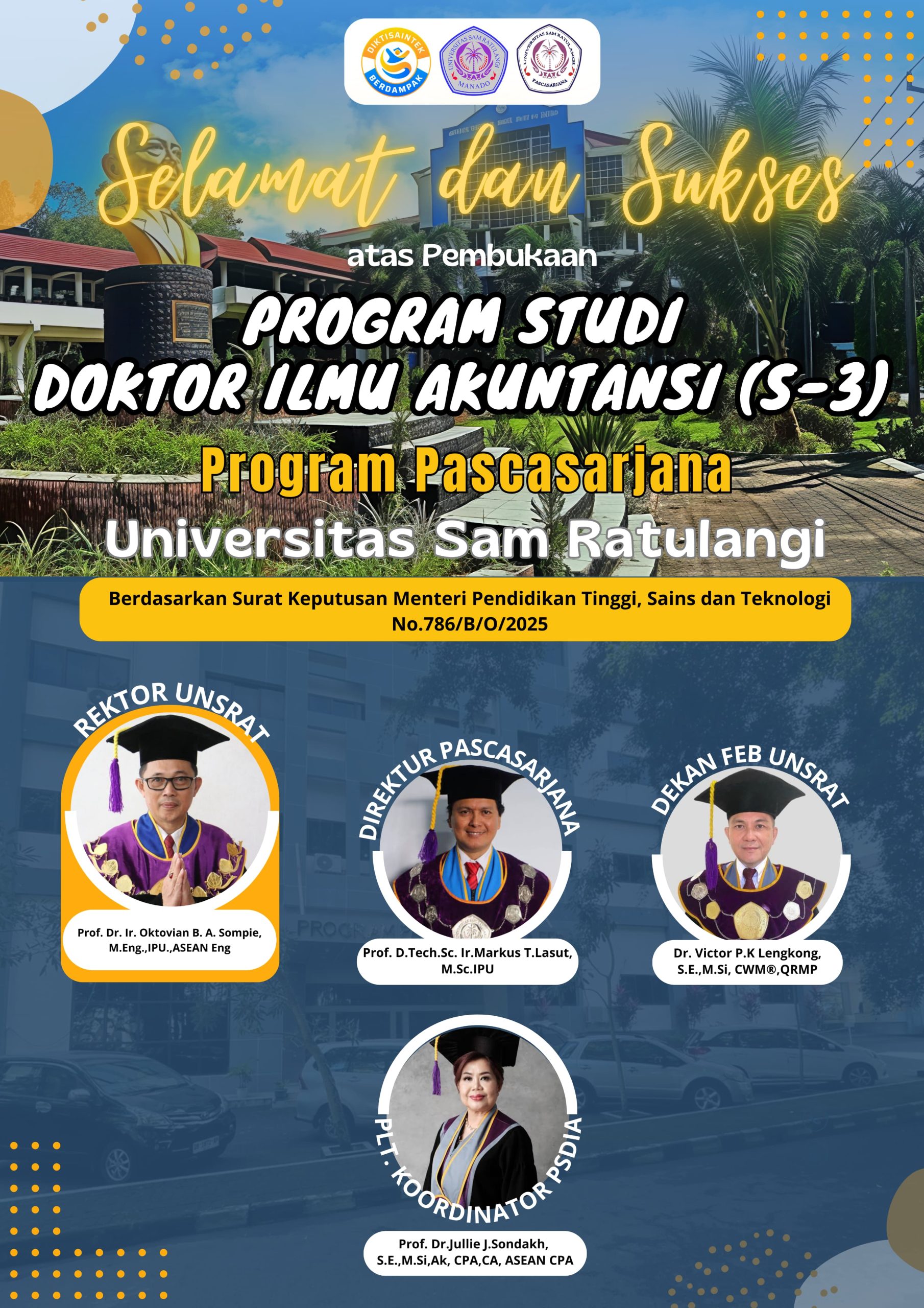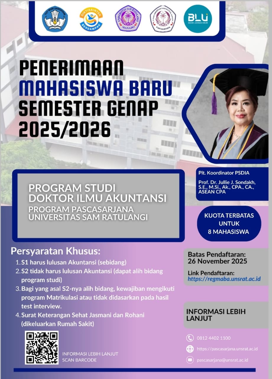 Sementara itu, Universitas Sam Ratulangi secara resmi mengumumkan pembukaan Program Studi Doktor Ilmu Akuntansi melalui Surat Keputusan Menteri Pendidikan Tinggi, Sains dan Teknologi No. 786/B/O/2025. Program ini berada di bawah pengelolaan Program Pascasarjana Unsrat.