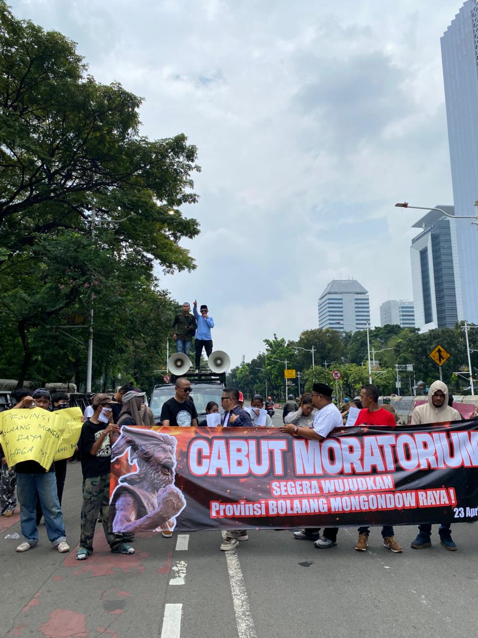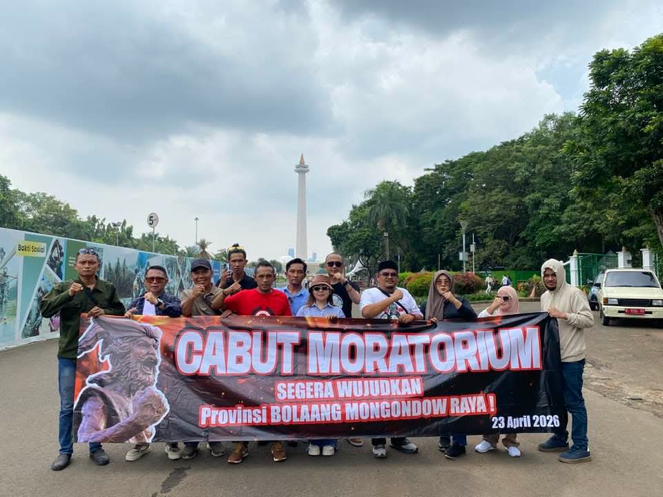 Sebanyak 50 orang yang tergabung dalam Aliansi Percepatan Pembentukan Pemekaran Provinsi Bolmong Raya (AP3BMR) serta aktivis dan mahasiswa peduli pemekaran, menggelar aksi unjuk rasa di depan Istana Merdeka, Jakarta Pusat, pada Kamis, 23 April 2026 siang tadi.